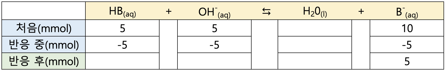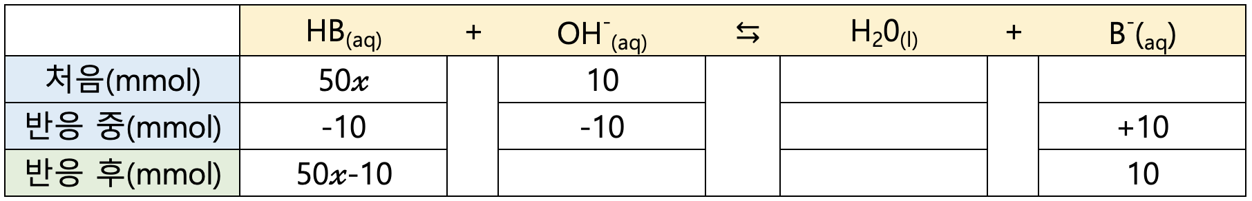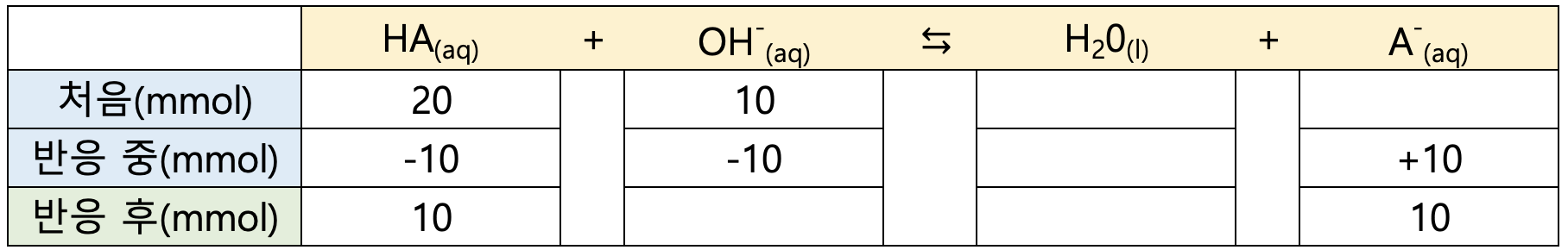 $$[HA_{(처음)}]\,=\,0.4M \, \times \,50mL\,=\,20mmol$$