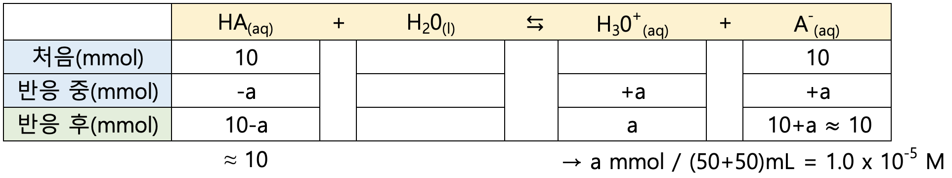 (10-a ≈ 10 이 된 이유는, HA가 약산이므로 10mmol에 비해 a는 굉장히 적은 양일 것이므로 계산의 편의성을 위해 근사한다.)